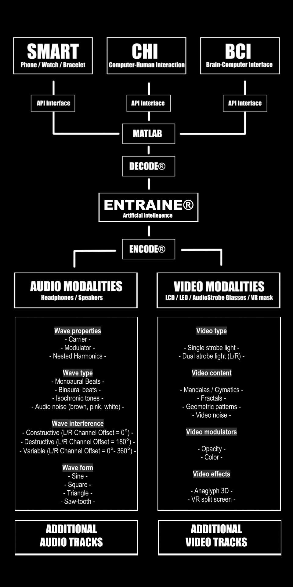 ENTRAINE®™ compiles the mathematical algorithms for audio and video transducers using the data from the SMART / C-H-I / B-C-I Technology as INPUT VARIABLES.